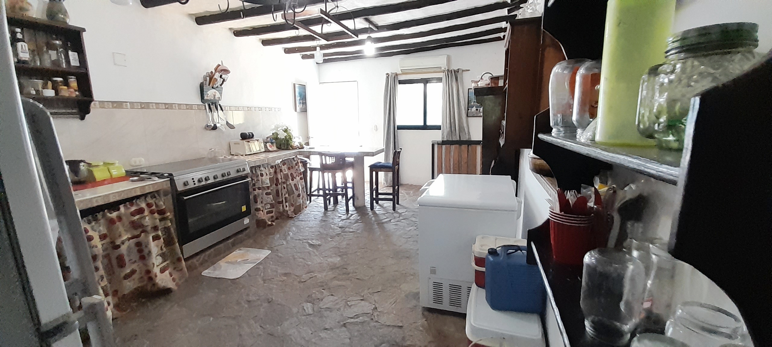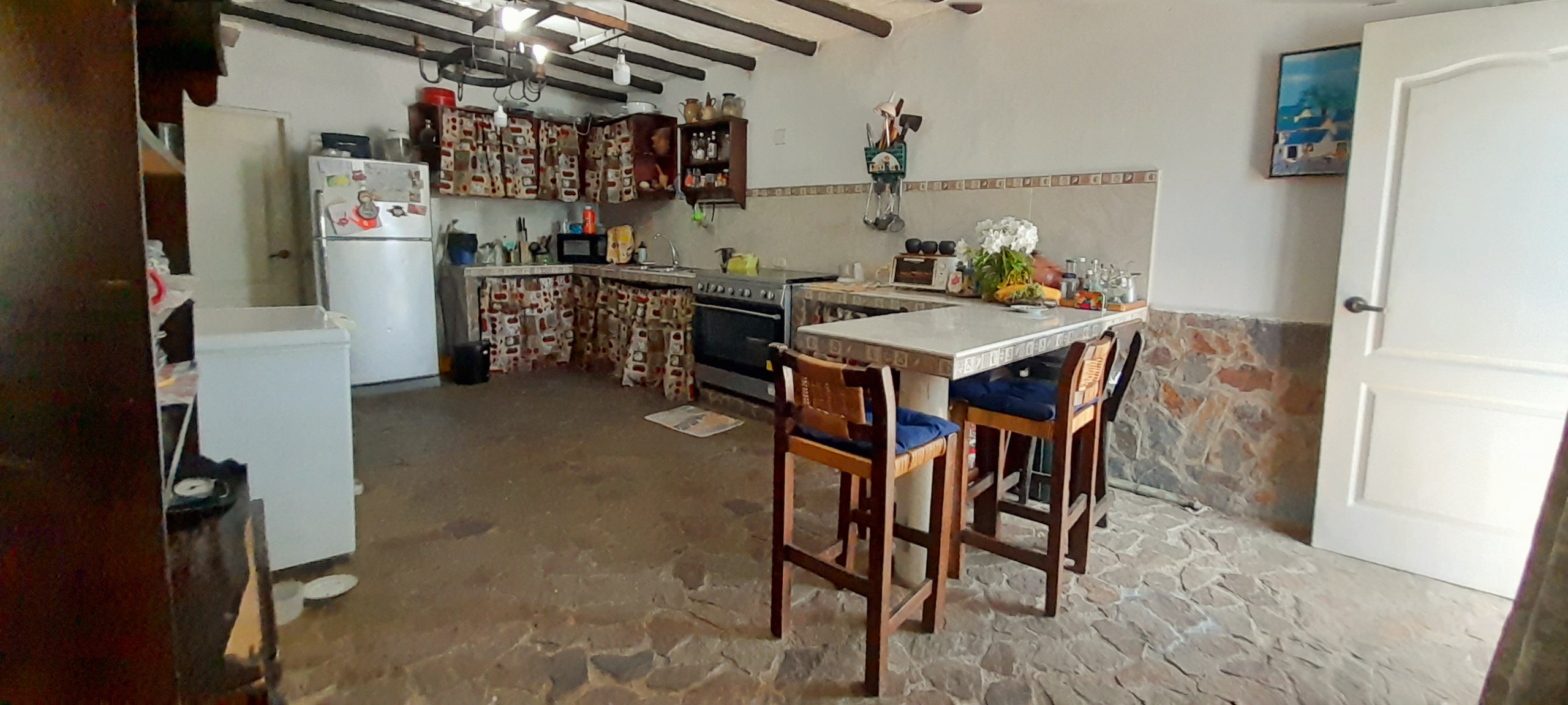– Cocina, nevera, chifonier, bancos de cocina(rodean el mesón)
