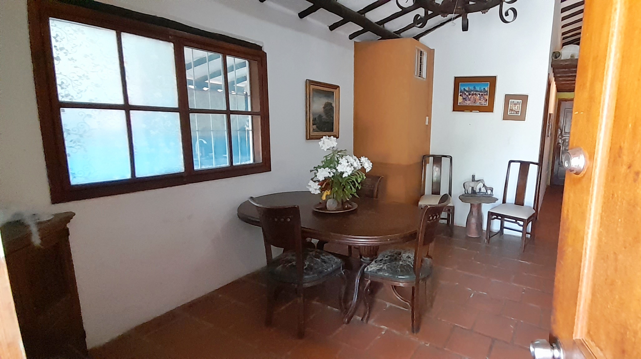 – Mesa de madera artesanal con 6 banquitos en la entrada.